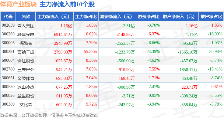 从资金流向上来看,当日体育产业板块主力资金净流出5.47亿元,游资资金净流出1.62亿元,散户资金净流入7.09亿元。体育产业板块个股资金流向见下表: