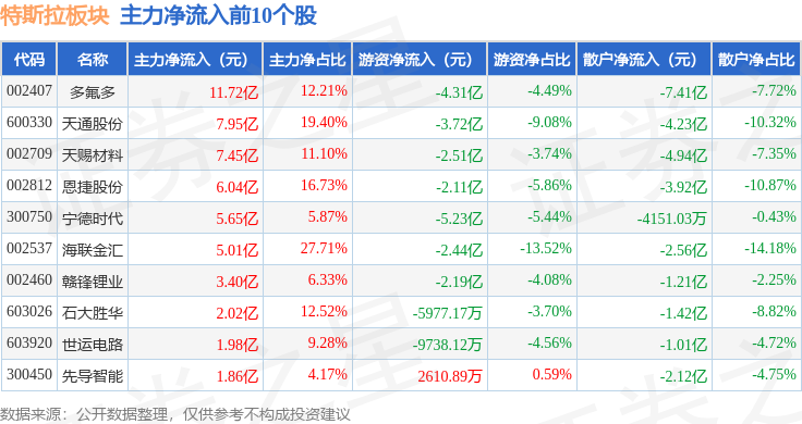 从资金流向上来看,当日特斯拉板块主力资金净流出14.58亿元,游资资金净流出18.5亿元,散户资金净流入33.09亿元。特斯拉板块个股资金流向见下表: