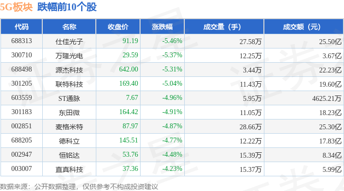 证券之星消息,12月26日5G板块较上一交易日下跌0.59%,仕佳光子领跌。当日上证指数报收于3963.68,上涨0.1%。深证成指报收于13603.89,上涨0.54%。5G板块个股涨跌见下表: