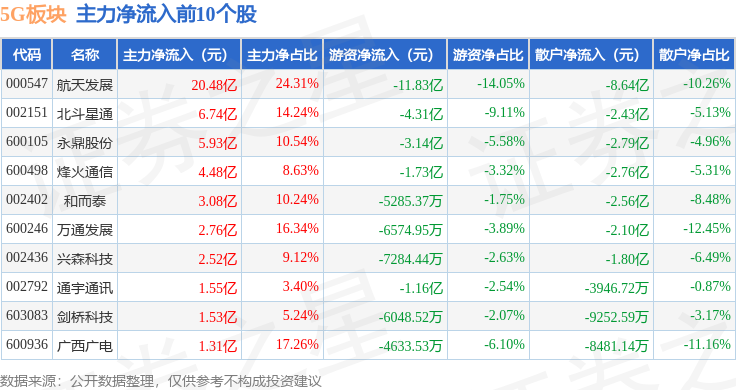 从资金流向上来看,当日5G板块主力资金净流出97.31亿元,游资资金净流入21.65亿元,散户资金净流入75.67亿元。5G板块个股资金流向见下表: