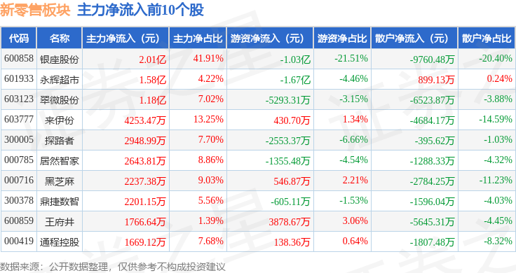 从资金流向上来看,当日新零售板块主力资金净流出3.32亿元,游资资金净流出4.47亿元,散户资金净流入7.79亿元。新零售板块个股资金流向见下表: