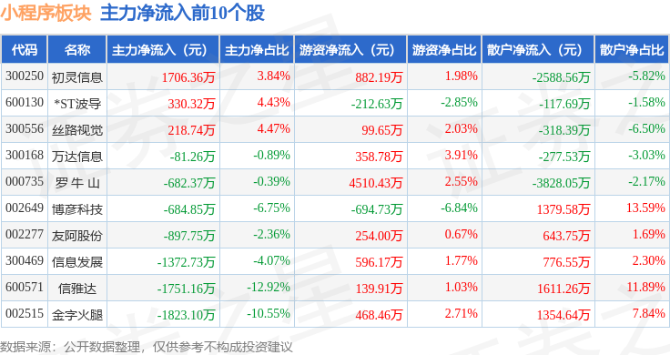 从资金流向上来看,当日小程序板块主力资金净流出3.76亿元,游资资金净流入1.03亿元,散户资金净流入2.73亿元。小程序板块个股资金流向见下表: