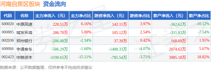 从资金流向上来看,当日河南自贸区板块主力资金净流出3564.8万元,游资资金净流出1989.24万元,散户资金净流入5554.04万元。河南自贸区板块个股资金流向见下表: