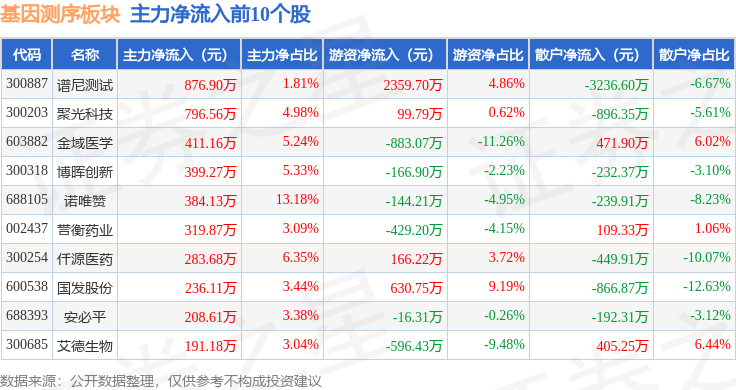 从资金流向上来看,当日基因测序板块主力资金净流出5.79亿元,游资资金净流入5698.54万元,散户资金净流入5.22亿元。基因测序板块个股资金流向见下表:
