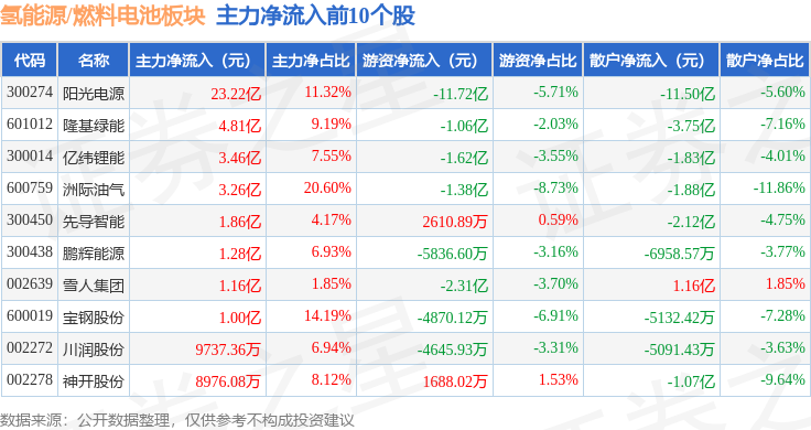 从资金流向上来看,当日氢能源/燃料电池板块主力资金净流出12.84亿元,游资资金净流出14.71亿元,散户资金净流入27.56亿元。氢能源/燃料电池板块个股资金流向见下表: