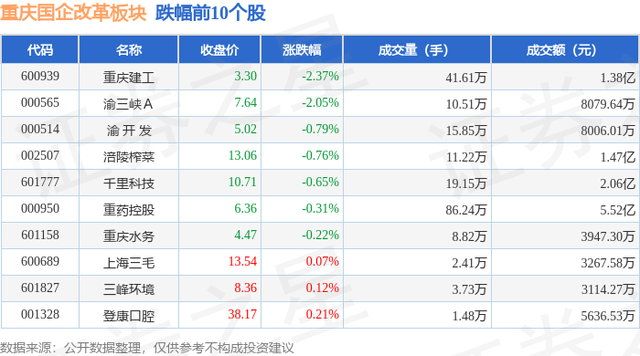 从资金流向上来看,当日重庆国企改革板块主力资金净流出1.28亿元,游资资金净流入6247.1万元,散户资金净流入6596.47万元。重庆国企改革板块个股资金流向见下表: