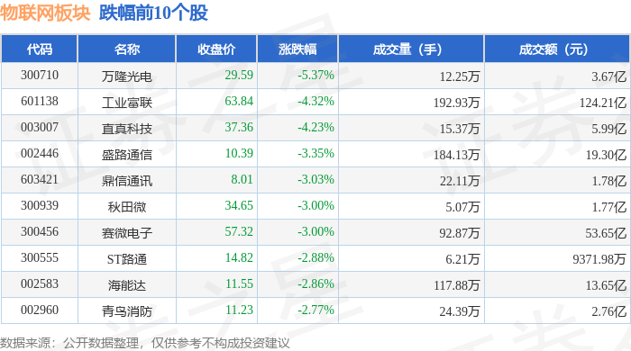 证券之星消息,12月26日物联网板块较上一交易日下跌0.81%,万隆光电领跌。当日上证指数报收于3963.68,上涨0.1%。深证成指报收于13603.89,上涨0.54%。物联网板块个股涨跌见下表: