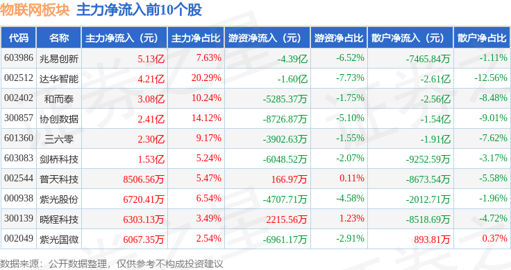 从资金流向上来看,当日物联网板块主力资金净流出66.62亿元,游资资金净流入3.87亿元,散户资金净流入62.74亿元。物联网板块个股资金流向见下表: