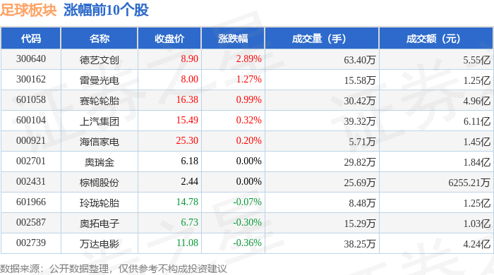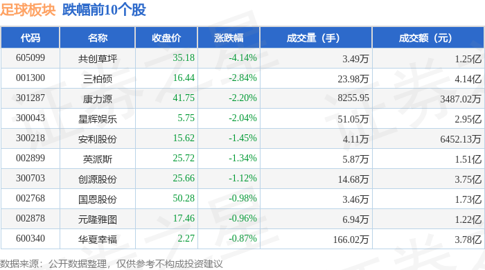 证券之星消息,12月26日足球板块较上一交易日下跌0.19%,共创草坪领跌。当日上证指数报收于3963.68,上涨0.1%。深证成指报收于13603.89,上涨0.54%。足球板块个股涨跌见下表: