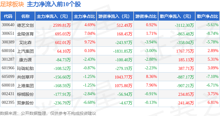 从资金流向上来看,当日足球板块主力资金净流出3.63亿元,游资资金净流入1.15亿元,散户资金净流入2.47亿元。足球板块个股资金流向见下表: