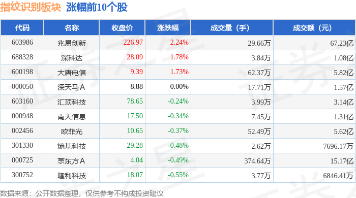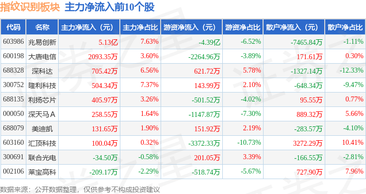 从资金流向上来看,当日指纹识别板块主力资金净流出3.66亿元,游资资金净流出3.59亿元,散户资金净流入7.25亿元。指纹识别板块个股资金流向见下表: