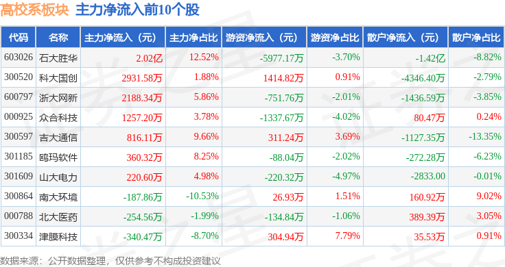 从资金流向上来看,当日高校系板块主力资金净流出2.05亿元,游资资金净流出186.23万元,散户资金净流入2.06亿元。高校系板块个股资金流向见下表: