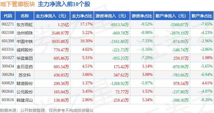 从资金流向上来看,当日地下管廊板块主力资金净流出1.41亿元,游资资金净流出8128.52万元,散户资金净流入2.22亿元。地下管廊板块个股资金流向见下表: