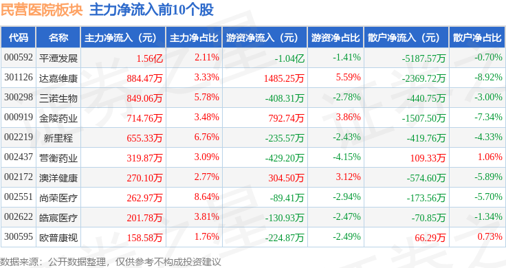 从资金流向上来看,当日民营医院板块主力资金净流出10.69亿元,游资资金净流入6901.34万元,散户资金净流入10.0亿元。民营医院板块个股资金流向见下表: