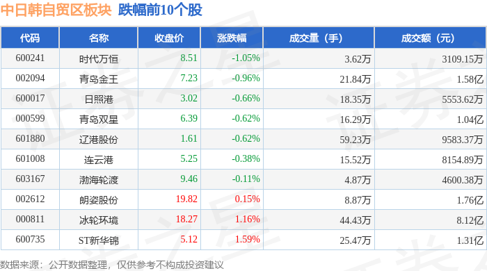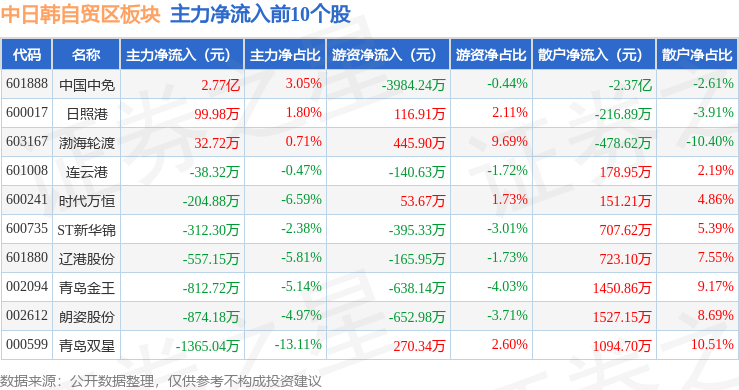 从资金流向上来看,当日中日韩自贸区板块主力资金净流入1.94亿元,游资资金净流出6563.05万元,散户资金净流出1.28亿元。中日韩自贸区板块个股资金流向见下表: