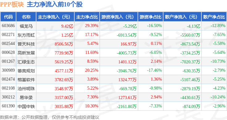 从资金流向上来看,当日PPP板块主力资金净流入1.2亿元,游资资金净流出7.08亿元,散户资金净流入5.87亿元。PPP板块个股资金流向见下表: