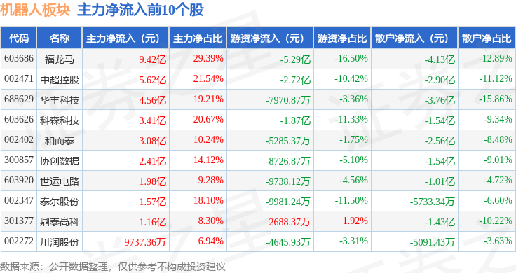 从资金流向上来看,当日机器人板块主力资金净流出121.93亿元,游资资金净流出7982.17万元,散户资金净流入122.73亿元。机器人板块个股资金流向见下表: