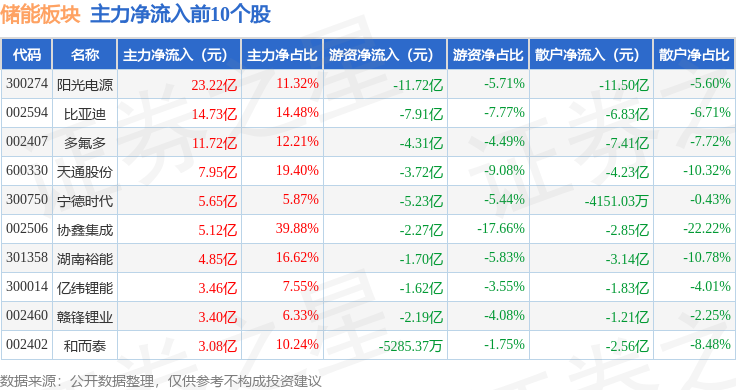 从资金流向上来看,当日储能板块主力资金净流入25.88亿元,游资资金净流出38.36亿元,散户资金净流入12.48亿元。储能板块个股资金流向见下表: