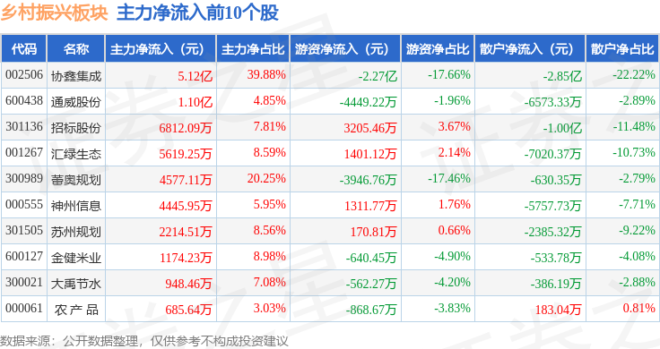 从资金流向上来看,当日乡村振兴板块主力资金净流入6.3亿元,游资资金净流出3.01亿元,散户资金净流出3.29亿元。乡村振兴板块个股资金流向见下表:
