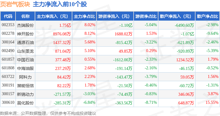 从资金流向上来看,当日页岩气板块主力资金净流出1.59亿元,游资资金净流出9651.29万元,散户资金净流入2.56亿元。页岩气板块个股资金流向见下表: