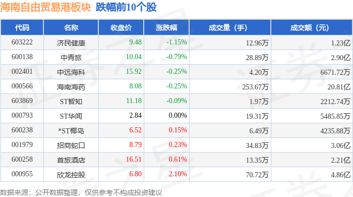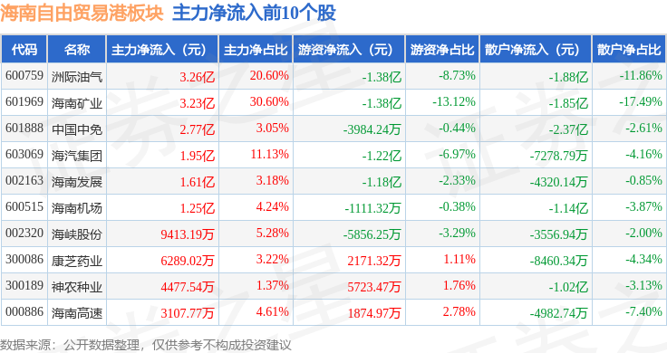 从资金流向上来看,当日海南自由贸易港板块主力资金净流入5.62亿元,游资资金净流出1.56亿元,散户资金净流出4.06亿元。海南自由贸易港板块个股资金流向见下表: