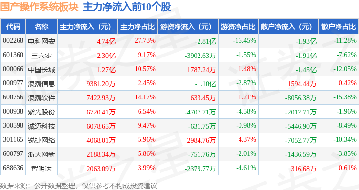 从资金流向上来看,当日国产操作系统板块主力资金净流入1.63亿元,游资资金净流出3.81亿元,散户资金净流入2.17亿元。国产操作系统板块个股资金流向见下表: