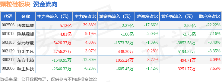 从资金流向上来看,当日颗粒硅板块主力资金净流入10.53亿元,游资资金净流出3.4亿元,散户资金净流出7.13亿元。颗粒硅板块个股资金流向见下表: