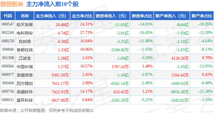 从资金流向上来看,当日信创板块主力资金净流出8.14亿元,游资资金净流出5.4亿元,散户资金净流入13.55亿元。信创板块个股资金流向见下表: