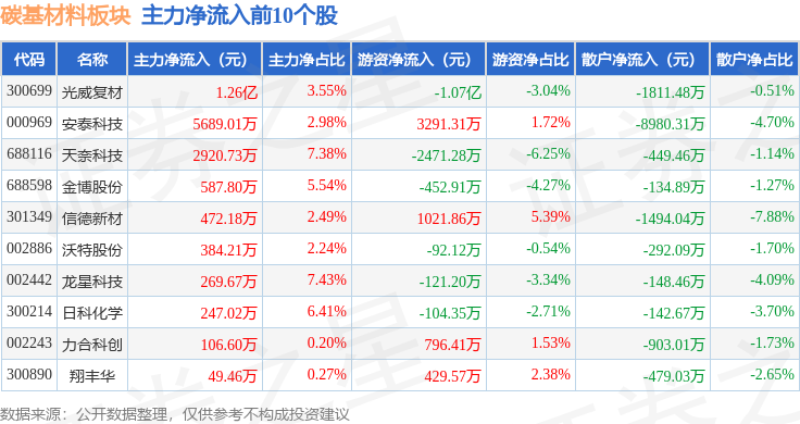 从资金流向上来看,当日碳基材料板块主力资金净流出6.43亿元,游资资金净流出767.07万元,散户资金净流入6.5亿元。碳基材料板块个股资金流向见下表: