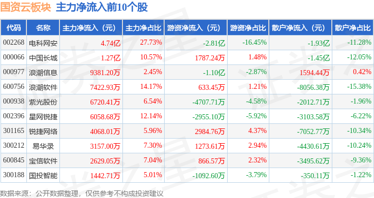 从资金流向上来看,当日国资云板块主力资金净流出8.03亿元,游资资金净流入1.69亿元,散户资金净流入6.33亿元。国资云板块个股资金流向见下表: