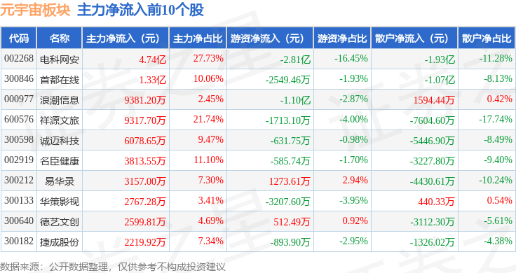 从资金流向上来看,当日元宇宙板块主力资金净流出19.15亿元,游资资金净流出1.39亿元,散户资金净流入20.54亿元。元宇宙板块个股资金流向见下表: