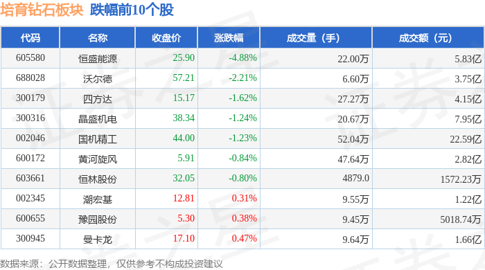 证券之星消息,12月26日培育钻石板块较上一交易日下跌0.42%,恒盛能源领跌。当日上证指数报收于3963.68,上涨0.1%。深证成指报收于13603.89,上涨0.54%。培育钻石板块个股涨跌见下表:
