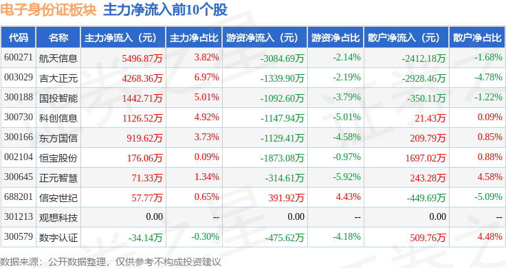 从资金流向上来看,当日电子身份证板块主力资金净流出1.16亿元,游资资金净流出1.49亿元,散户资金净流入2.65亿元。电子身份证板块个股资金流向见下表: