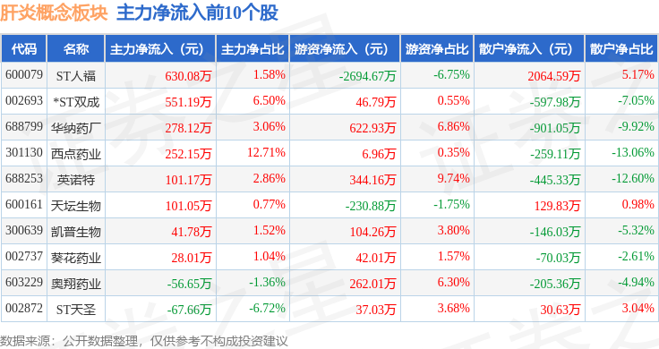 从资金流向上来看,当日肝炎概念板块主力资金净流出1.42亿元,游资资金净流入569.35万元,散户资金净流入1.36亿元。肝炎概念板块个股资金流向见下表: