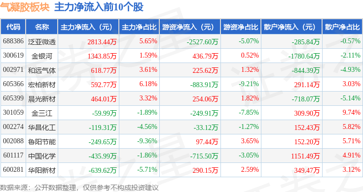 从资金流向上来看,当日气凝胶板块主力资金净流出2.34亿元,游资资金净流出5700.8万元,散户资金净流入2.91亿元。气凝胶板块个股资金流向见下表: