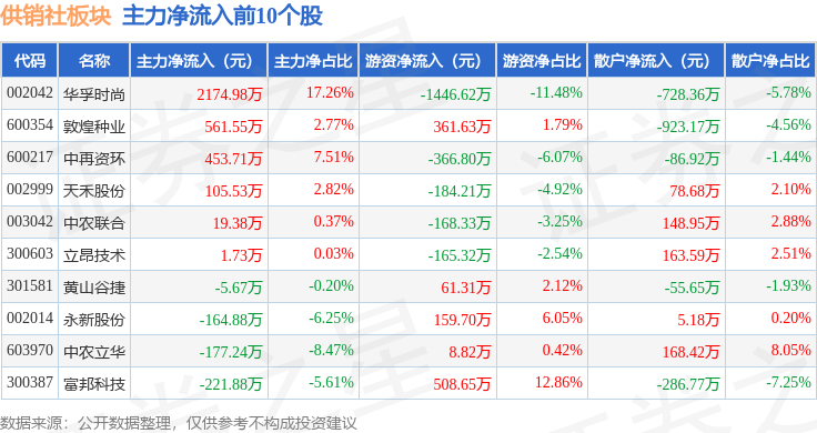 从资金流向上来看,当日供销社板块主力资金净流出7659.08万元,游资资金净流出3106.4万元,散户资金净流入1.08亿元。供销社板块个股资金流向见下表: