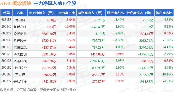 从资金流向上来看,当日AIGC概念板块主力资金净流出11.32亿元,游资资金净流出3.82亿元,散户资金净流入15.14亿元。AIGC概念板块个股资金流向见下表: