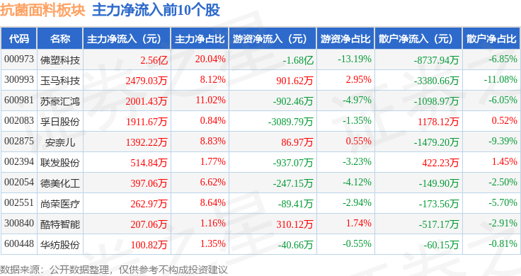 从资金流向上来看,当日抗菌面料板块主力资金净流入2.24亿元,游资资金净流出2.2亿元,散户资金净流出372.95万元。抗菌面料板块个股资金流向见下表: