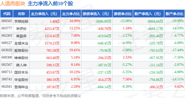 从资金流向上来看,当日人造肉板块主力资金净流出2.91亿元,游资资金净流出6344.58万元,散户资金净流入3.54亿元。人造肉板块个股资金流向见下表: