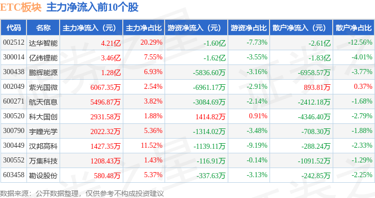 从资金流向上来看,当日ETC板块主力资金净流出2697.1万元,游资资金净流出5.39亿元,散户资金净流入5.66亿元。ETC板块个股资金流向见下表: