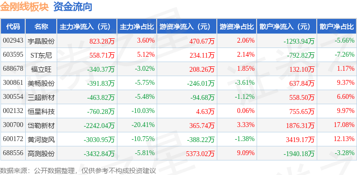 从资金流向上来看,当日金刚线板块主力资金净流出9280.13万元,游资资金净流入5927.51万元,散户资金净流入3352.62万元。金刚线板块个股资金流向见下表: