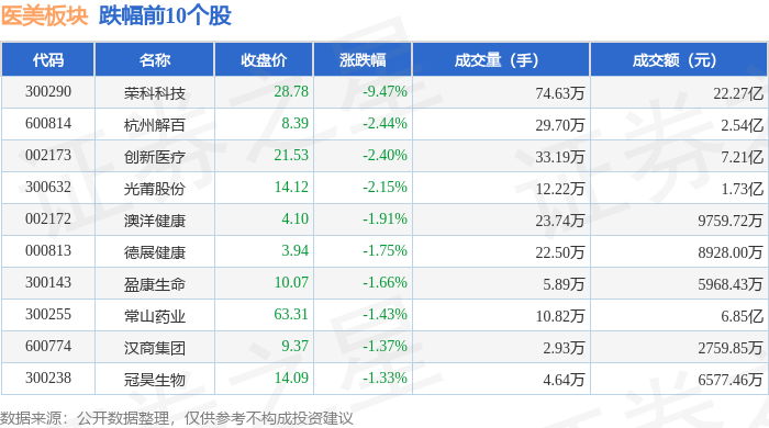 证券之星消息,12月26日医美板块较上一交易日下跌0.63%,荣科科技领跌。当日上证指数报收于3963.68,上涨0.1%。深证成指报收于13603.89,上涨0.54%。医美板块个股涨跌见下表: