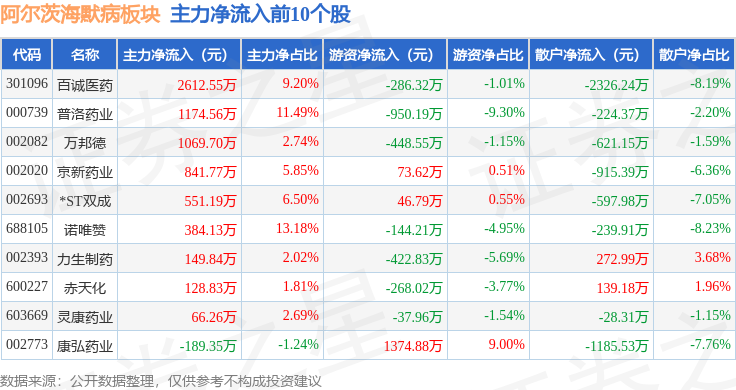 从资金流向上来看,当日阿尔茨海默病板块主力资金净流出5.49亿元,游资资金净流入1.85亿元,散户资金净流入3.64亿元。阿尔茨海默病板块个股资金流向见下表: