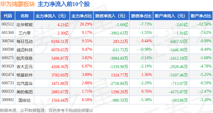 从资金流向上来看,当日华为鸿蒙板块主力资金净流出9.44亿元,游资资金净流出1.64亿元,散户资金净流入11.08亿元。华为鸿蒙板块个股资金流向见下表: