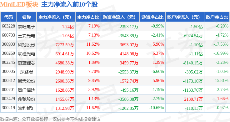 从资金流向上来看,当日MiniLED板块主力资金净流出22.83亿元,游资资金净流入7.04亿元,散户资金净流入15.79亿元。MiniLED板块个股资金流向见下表: