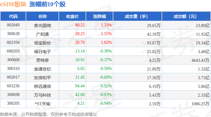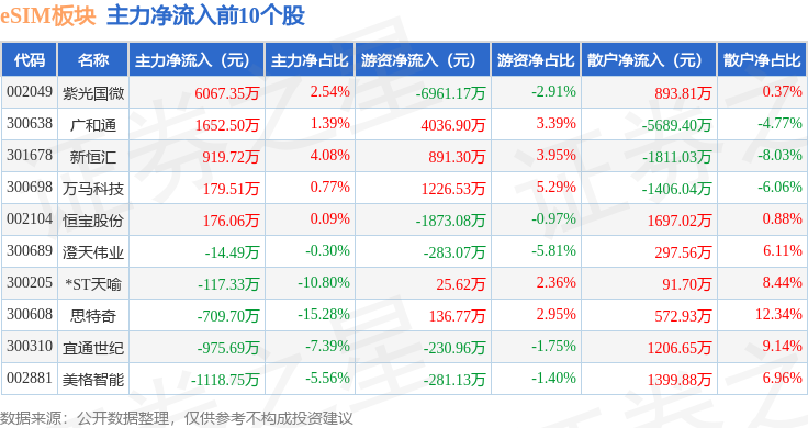 从资金流向上来看,当日eSIM板块主力资金净流出8772.98万元,游资资金净流出5171.35万元,散户资金净流入1.39亿元。eSIM板块个股资金流向见下表: