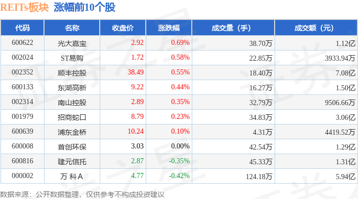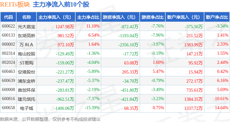 从资金流向上来看,当日REITs板块主力资金净流出4.77亿元,游资资金净流入1.75亿元,散户资金净流入3.02亿元。REITs板块个股资金流向见下表:
