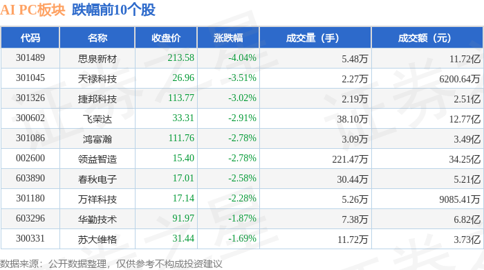 证券之星消息,12月26日AI PC板块较上一交易日下跌0.73%,思泉新材领跌。当日上证指数报收于3963.68,上涨0.1%。深证成指报收于13603.89,上涨0.54%。AI PC板块个股涨跌见下表: