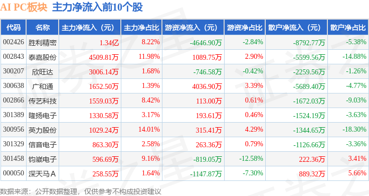 从资金流向上来看,当日AI PC板块主力资金净流出15.37亿元,游资资金净流入3755.13万元,散户资金净流入15.0亿元。AI PC板块个股资金流向见下表: