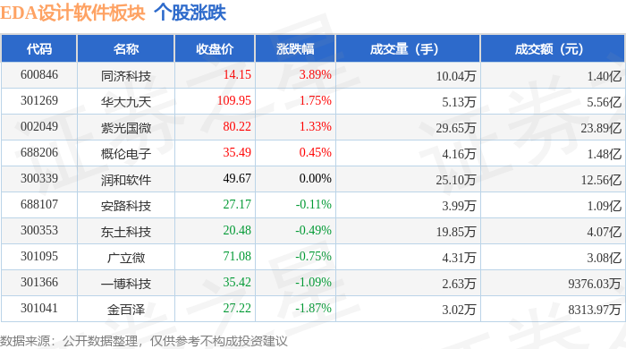 证券之星消息,12月26日EDA设计软件板块较上一交易日上涨0.92%,同济科技领涨。当日上证指数报收于3963.68,上涨0.1%。深证成指报收于13603.89,上涨0.54%。EDA设计软件板块个股涨跌见下表: